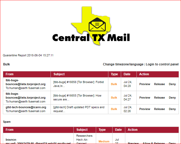 At any time an end user can login to the FuseMail Control Panel (Login to control panel) to view the most recently quarantined messages.